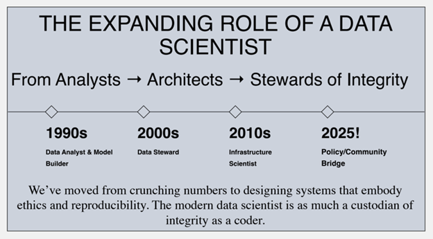 Figure 2: The Expanding Role of the Data Scientist by Gitanjali Yadav, reflecting on how the data scientist’s identity has evolved, from analyst (focused on computation and inference), to architect (building systems and workflows), to steward of integrity (ensuring ethics, transparency, and trust), making the present day data scientist a custodian of integrity and a community bridge.