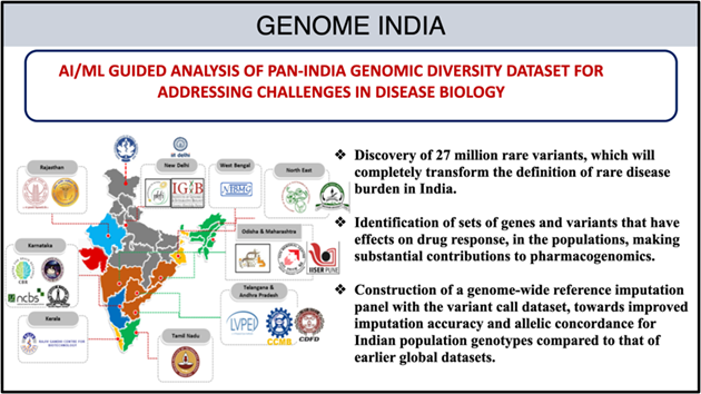 Figure 3. AI-Guided Genomic Discovery in India: Screenshot of the Genome India project slide presented by Gitanjali Yadav on behalf of Debasisa Mohanty, depicting AI/ML-guided exploration of genomic diversity across India, discovering over 27 million rare variants, identifying population-specific drug-response markers, and constructing a genome-wide imputation panel that improves precision for Indian genotypes.