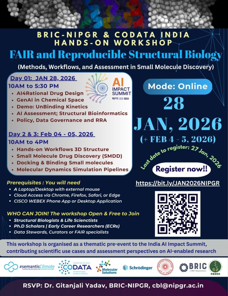 The upcoming workshop on “FAIR and Reproducible Structural Biology: Methods, Workflows, and Assessment,” brings together scientists, data experts, and policy communities to link AI for Science, FAIR data, reproducibility, and responsible research assessment. Convened under CODATA’s new Open Tools and Visitation Frameworks for Global Research Assessment Reform (OT-ViRARe) Task Group, this workshop is a thematic pre-event to the India AI Impact Summit, aiming to address How AI-driven structural biology should be documented, governed, and assessed.